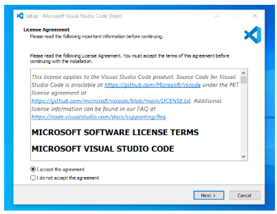 Bước 4: Sau khi Trình cài đặt mở ra, bạn sẽ được yêu cầu chấp nhận các điều khoản và điều kiện của Visual Studio Code. Nhấp vào "Tôi chấp nhận thỏa thuận" rồi nhấp vào nút "Tiếp theo".