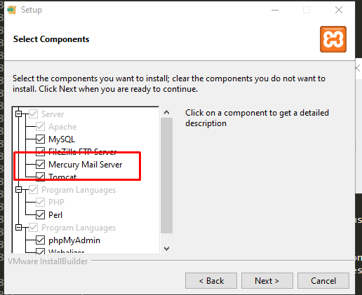 Trong quá trình cài đặt cần quan tâm: Webalizer, Mecury Mail, FileZilla FTP Server, Tomcat, Perl... nếu không dùng có thể bỏ tích để đỡ tốn tài nguyên. Chủ yếu quan tâm MySQL, phpmyadmin