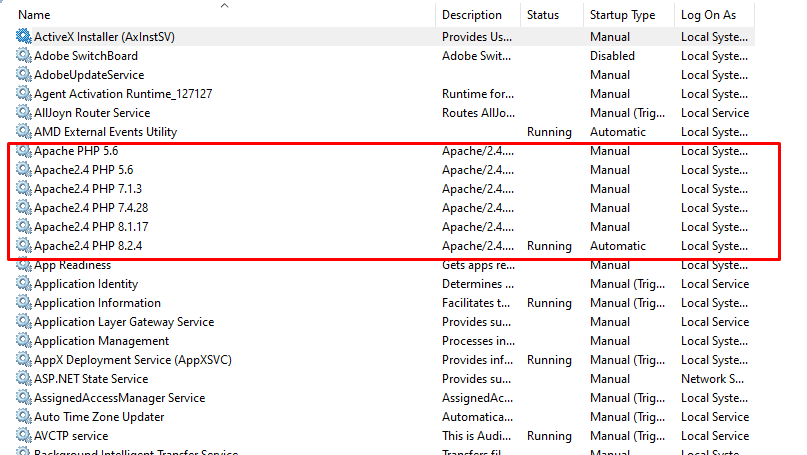 httpd.exe -k uninstall -n "Apache2.4 PHP 8.2"Lưu ý: Thay tên PHP 8.2 bằng phiên bản PHP tương ứng để dễ nhớ.