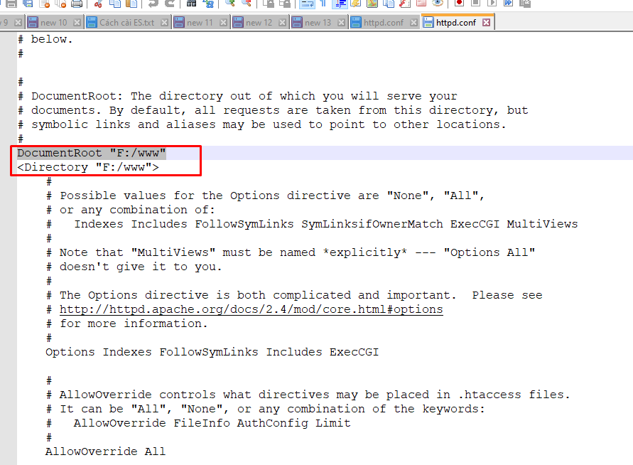Mở httpd.conf tìm DocumentRoot sửa thành DocumentRoot “F:/www” làm tương tự với các phiên bản khác, để dùng chung 1 thư mục dự án